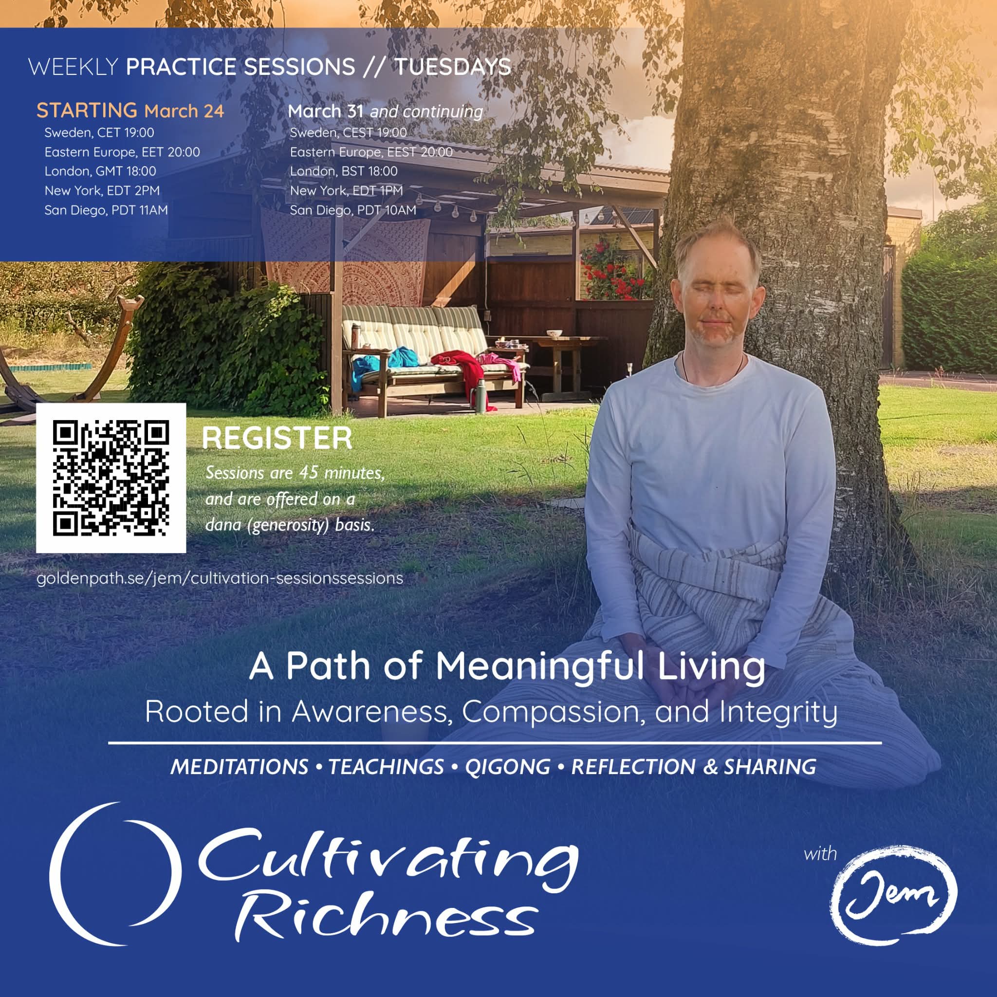 Each session begins with a brief check-in in the chat, followed by about 30 minutes of guided practice or teaching from Jem. The final 10 minutes are open for sharing, reflections, or questions. Every gathering includes a simple, practical exercise you can carry with you into the coming week.